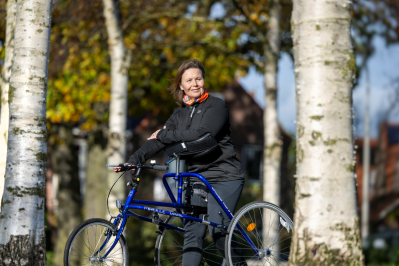 Ik ben Mireille, een sportend stuiterkonijn met een spierziekte. Waar ik me vroeger hardlopend gezond hield, doe ik dat nu op een framerunner.